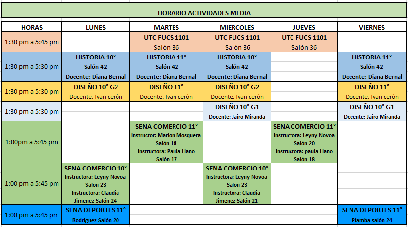 Actividades de Educación Media según horario y grupos establecidos (UTC 11°, Historia 11°  – Diseño 11° – SENA Comercio 11°).