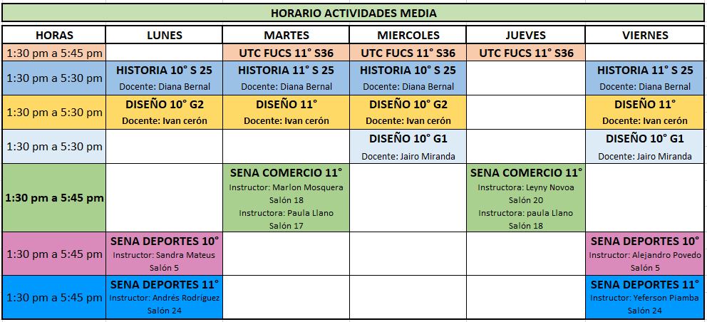 3 hora. Cursos  1001 y 1002. Taller habilidades sociales y prevención de conductas de riesgo. Lidera orientación escolar. Teatro 2Actividades de Educación Media según horario y grupos establecidos (UTC 11°, Historia 11°  – Diseño 11° – SENA Comercio 11°).English in action: Los estudiantes de noveno que están inscritos tienen clases de inglés de 1:30 p. m. a 3:30 p.m. Deben traer refrigerio para este espacio y los materiales solicitados.
