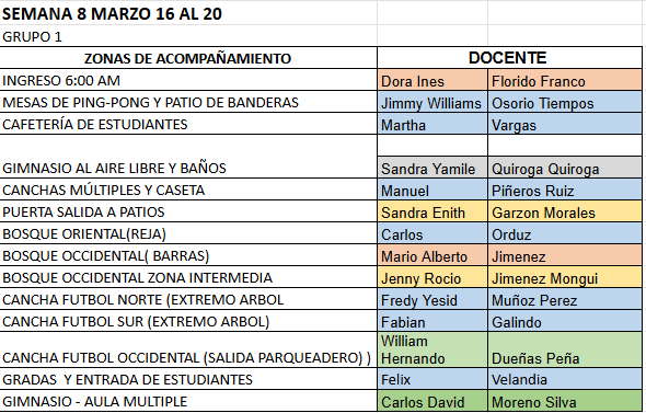 | 2a Hora Formación: 6°, 8° y 9° Aula múltiple. 7°, 10° y 11° patio de banderas. Actividades de Educación Media según horario y grupos establecidos (Historia 11° – Diseño 11° Diseño 10° G1 – SENA Deportes 10° y 11°).1:30 pm a 3:30 pm. |