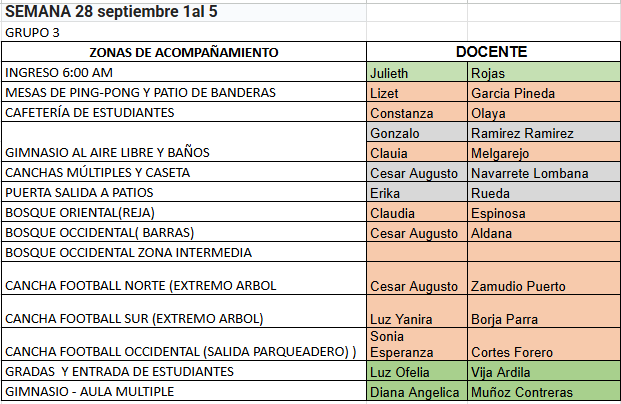 Lunes 01 | 7:00 am Formación grado sexto, séptimo y octavo: aula múltiple. Grados 10° y 11° en patio de banderas. 4a Hora. Taller “Atención y lectura” Educación Inclusiva. Curso 602. Aula de Educación Emocional y salón de clases. Proyecto bilingüismo: Capacitación virtual EAFIT estudiantes seleccionados de noveno a once de 8:00 am a 9:00 am aula de bilingüismo. Actividades académicas de Media (10° Y 11°), según líneas, programas y horarios establecidos. (SENA, LÍNEAS PROPIAS) English in action: Los estudiantes seleccionados asistirán con su refrigerio a la sesión de 1:30 p. m. a 4:30 p. m. |