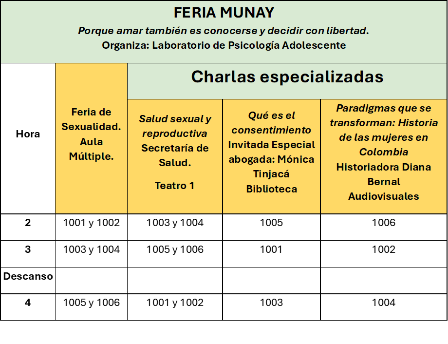 Viernes26 | 6:30 a 10:25 am. Feria de Sexualidad «MUNAY», asisten estudiantes de grado décimo y los integrantes Laboratorio Psicología adolescente (ver programación abajo). 3a Hora : 904 y 4a Hora: 906. Sesión 2: Programa de Orientación Socio Ocupacional: Toma de decisiones. Salón 8. Orientación Escolar. |
