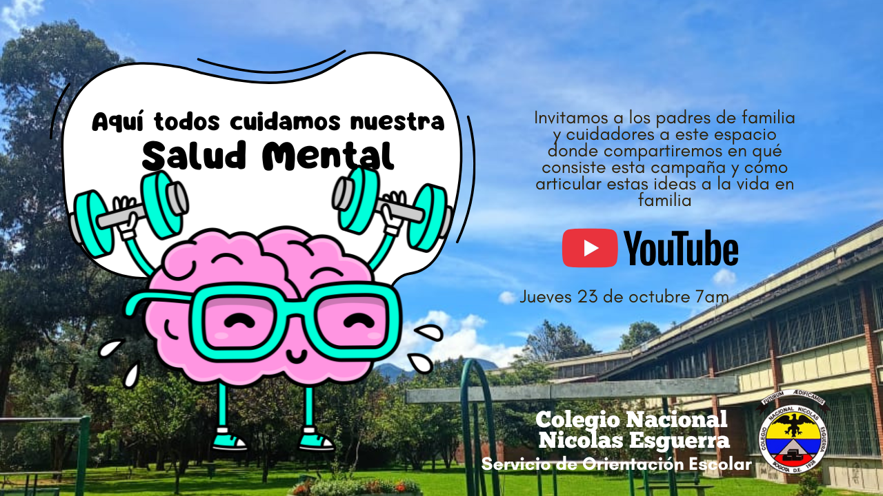 Escuela de Padres: Campaña Aquí todos cuidamos nuestra salud mental. Jueves 23 de octubre de 2025. 7:00 am Canal Youtube. Invita Orientación Escolar. Asistencia obligatoria.